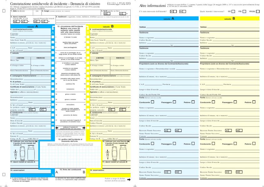 Si tratta del modello di constatazione amichevole di incidente ed è previsto dalla Convenzione per l’indennizzo diretto. E’ un documento che si deve tenere in auto e che, all’occorrenza, dovrà essere redatto e sottoscritto congiuntamente dai conducenti dei due veicoli coinvolti.